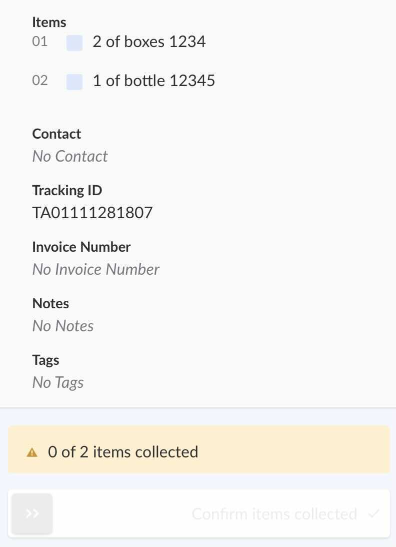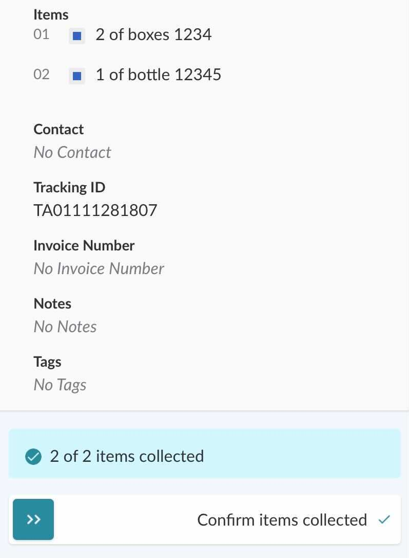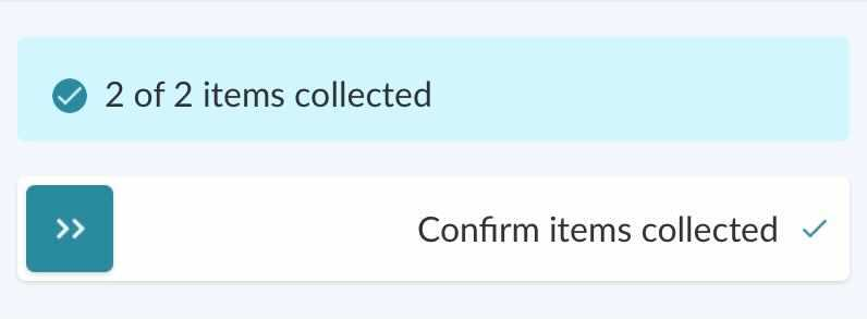 - Once all of the items in all of the tasks have been scanned, swipe Confirm items collected. If there are still items that have not been scanned, the button can not be swiped.