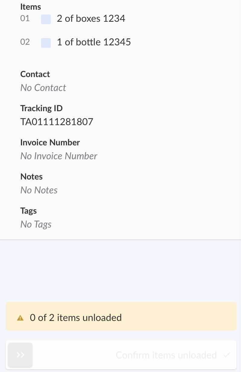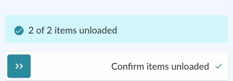 - Once all of the items in all of the tasks have been scanned, swipe Confirm items unloaded. If there are still items that have not been scanned, the button can not be swiped.
