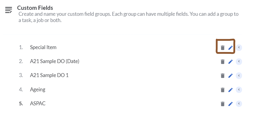 Note: The contents and data types of existing fields cannot be changed as this will result in conflicts for existing tasks that use these fields. - You may edit the name of the Custom Fields Group and the name of the Custom Fields. The changes will be reflected in all instances of its use.