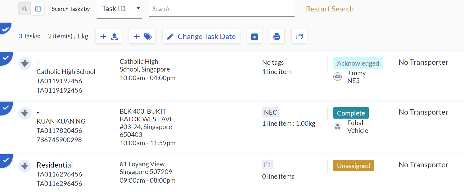 - You may search for part of the Task ID / Tracking ID / Invoice No., as long as there are fewer than 10 matching results. If there are more than 10 matching results, you will be prompted to use a more unique ID.
