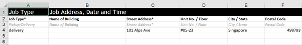 - In the first 'Jobs' tab, fill in Job information according to the fields in Row 2. The examples are shown in rows 4-12 which you should delete before saving the file. Fields with the asterisk (*) are compulsory – the file will be rejected if there’s a blank in the compulsory field.