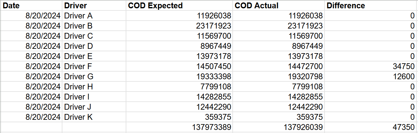 - The last row calculates the total for each COD column (COD Expected, COD Actual and Difference)