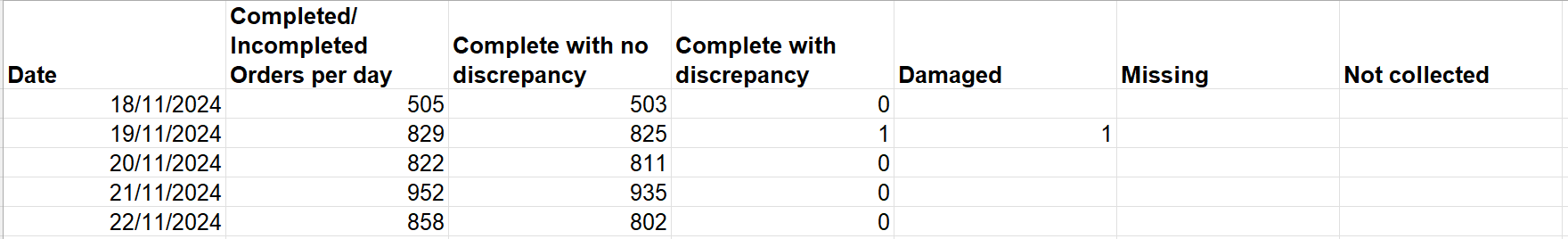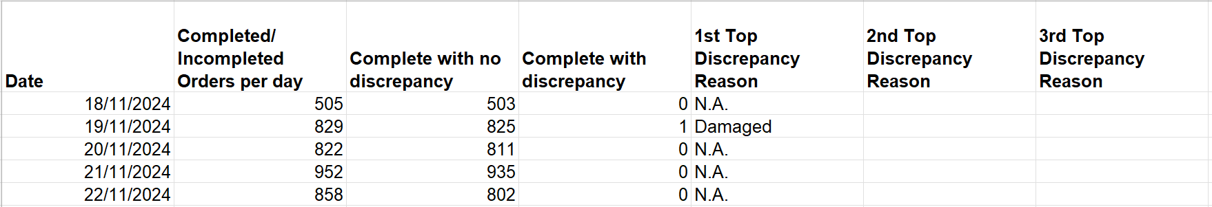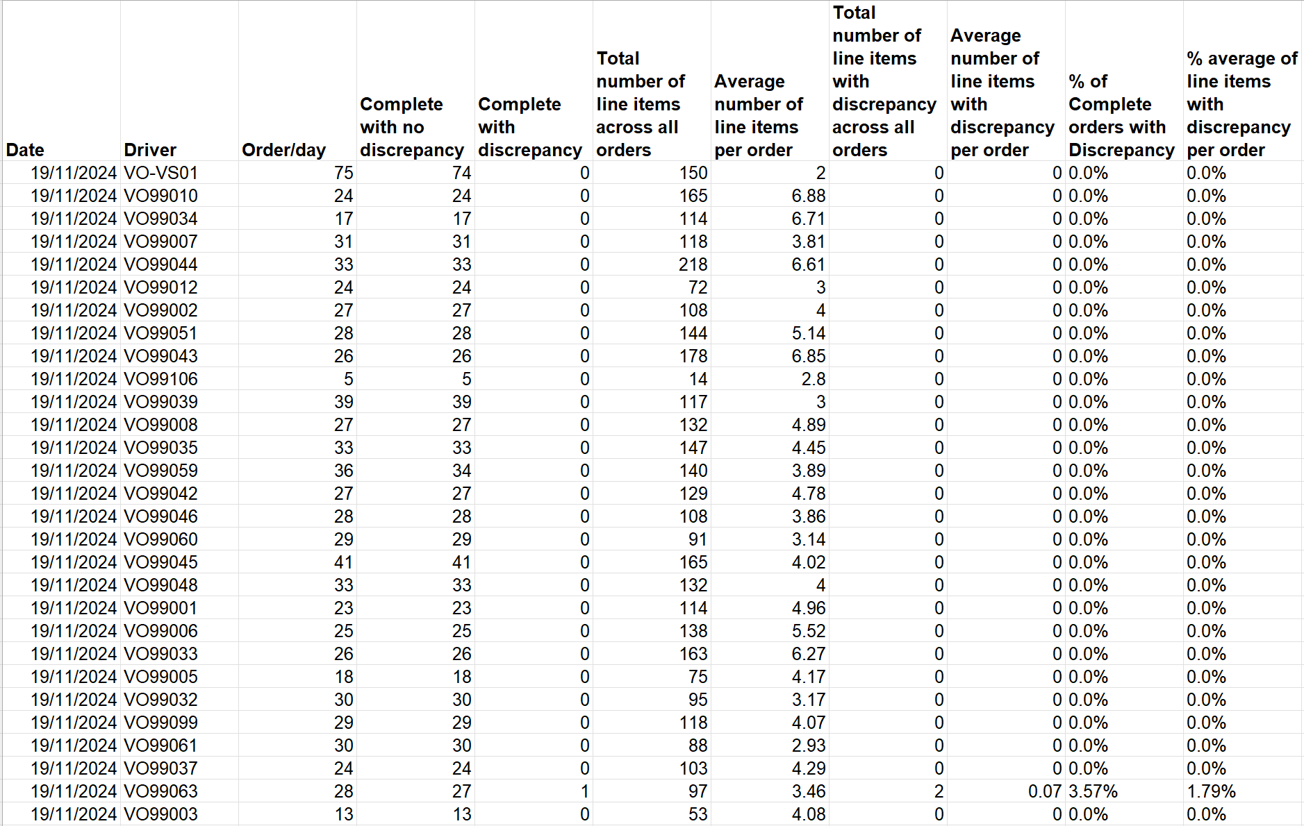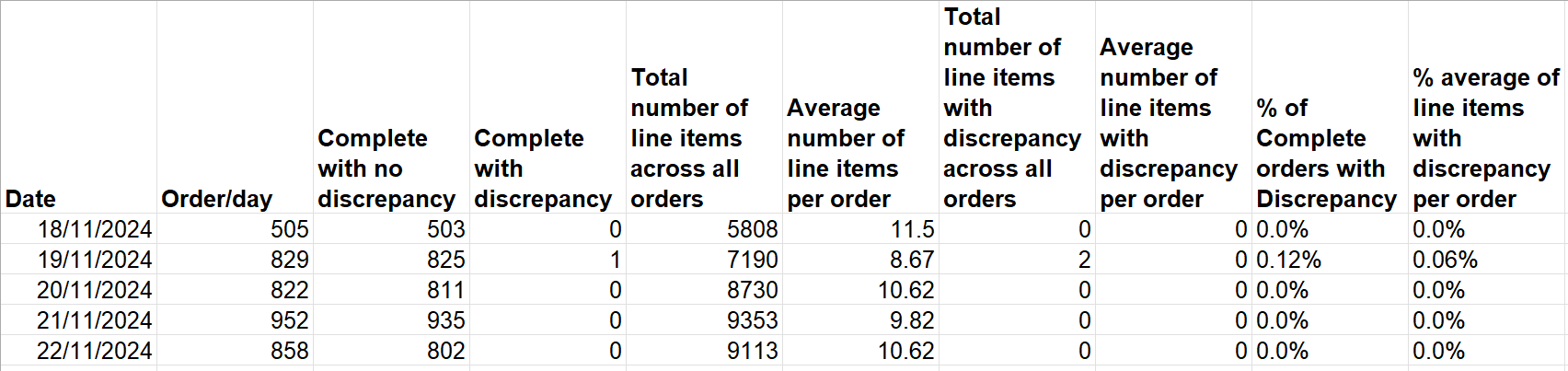 - Average number of line items with discrepancy per order is measured by taking 'Total number of line items with discrepancy across all orders' divided by 'Order/day'