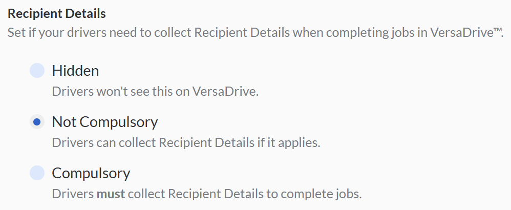 - Under 'Recipient Details', specify whether the information should be Hidden, Not Compulsory, or Compulsory for drivers.