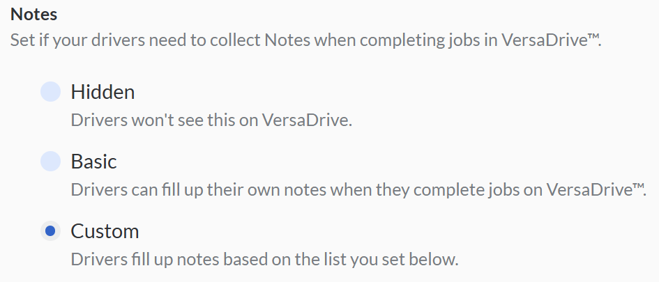 - Basic: Drivers can fill up their own notes when they complete jobs in VersaDrive