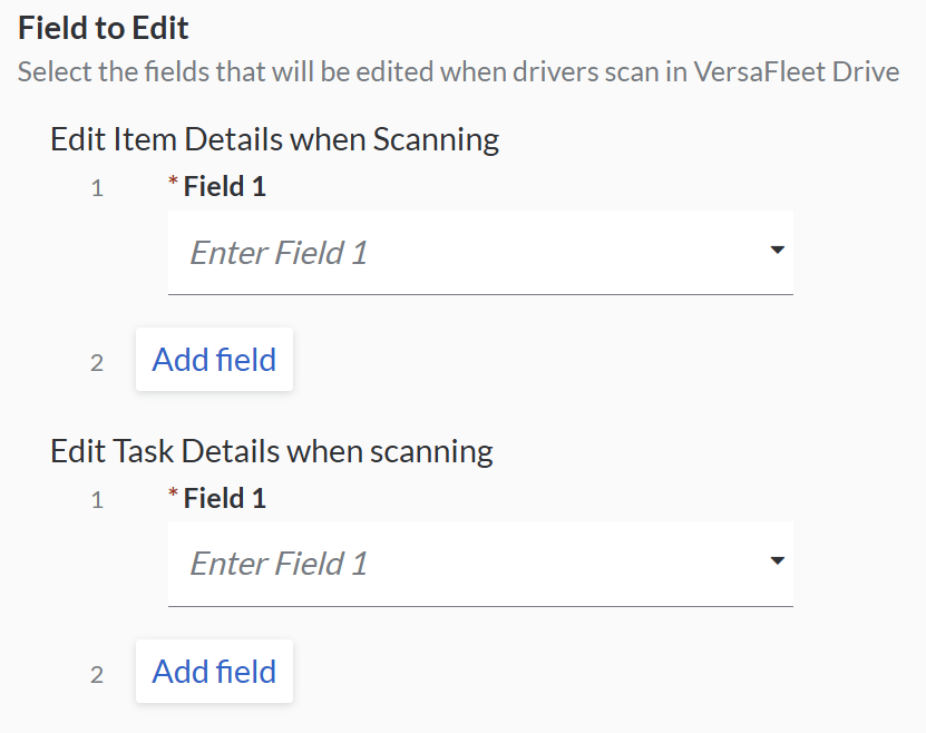 - If enabled, under 'Field to Edit', select the fields that will be edited when drivers scan in VersaFleet Drive: