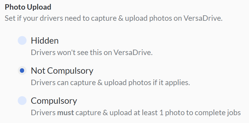 - Under 'Photo Upload', set whether the photo requirement should be Hidden, Not Compulsory, or Compulsory for drivers.